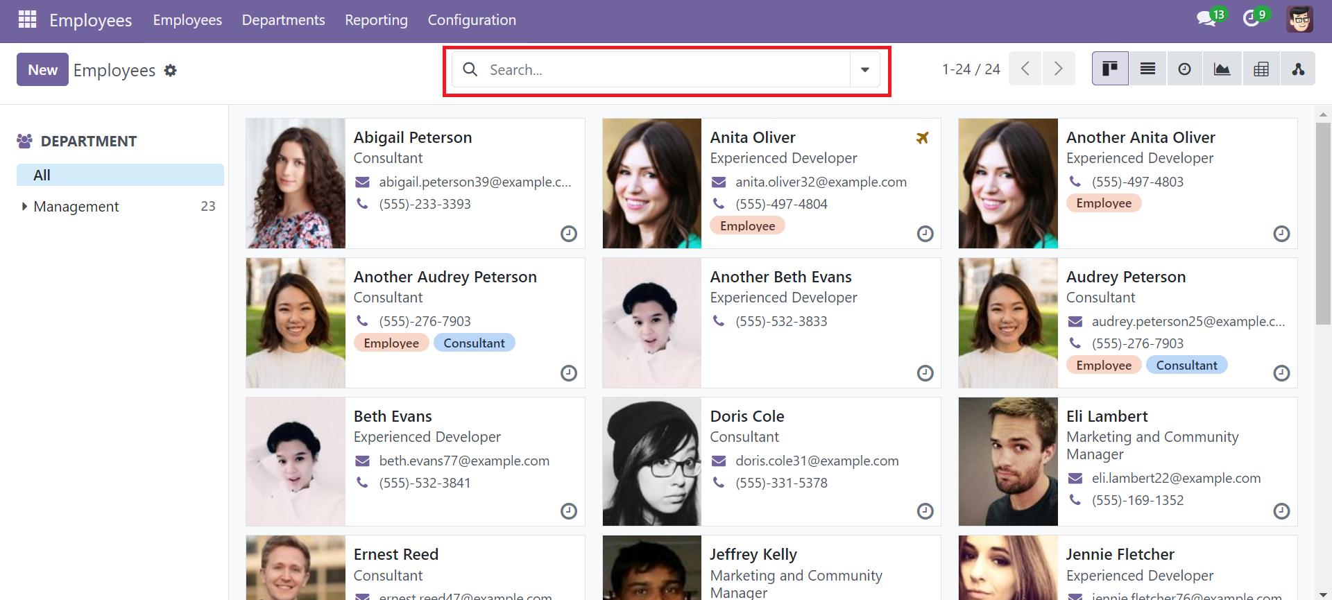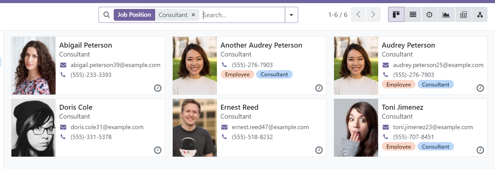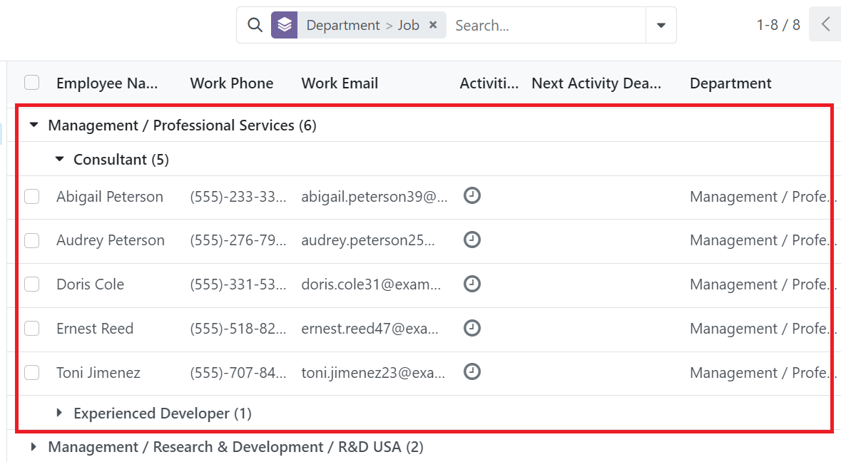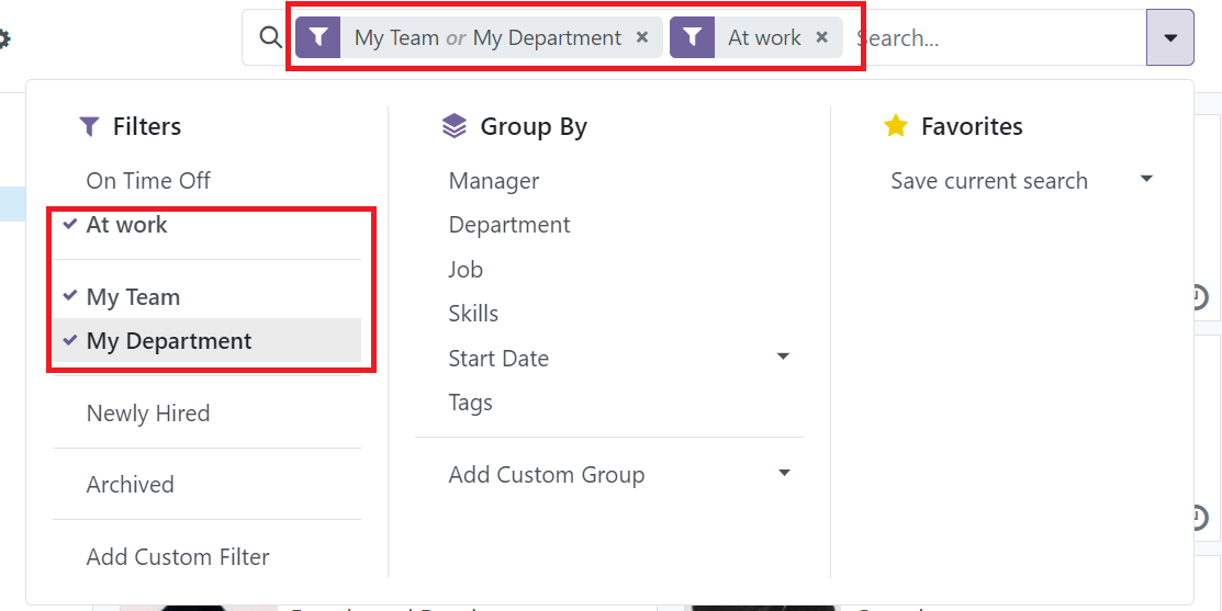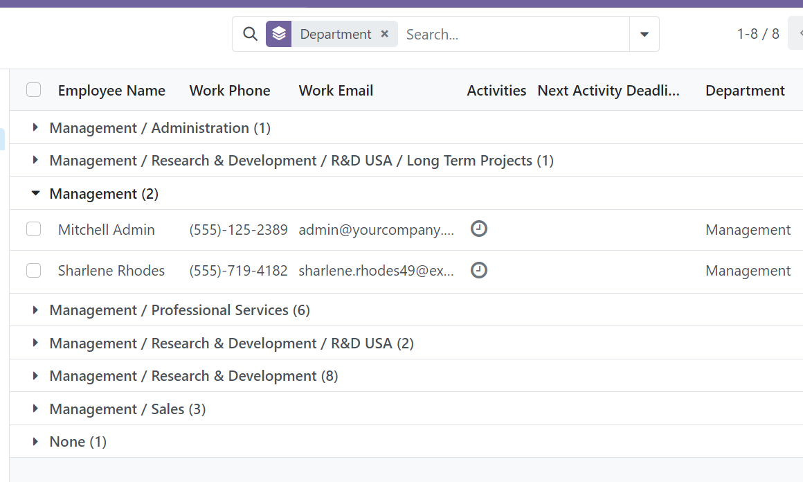 The presence of the search bar help us to search the records quickly, filter out unwanted records and grouping records by specific information with preset filters and group-by terms.