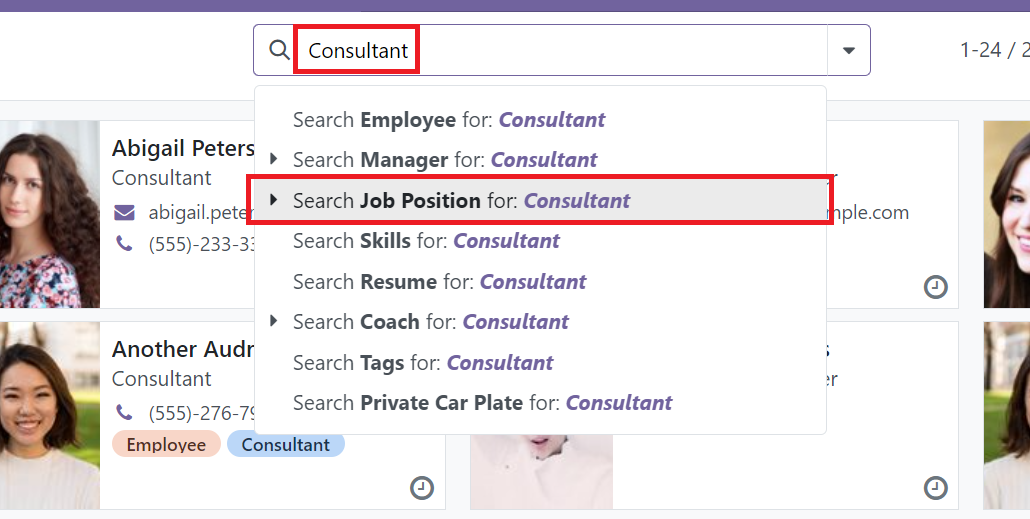 In order to search records with the keyword located in other fields, simply type the keyword in the search bar. Then, select the field would like to search.
