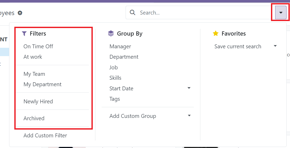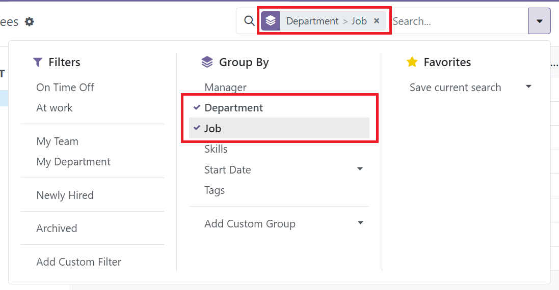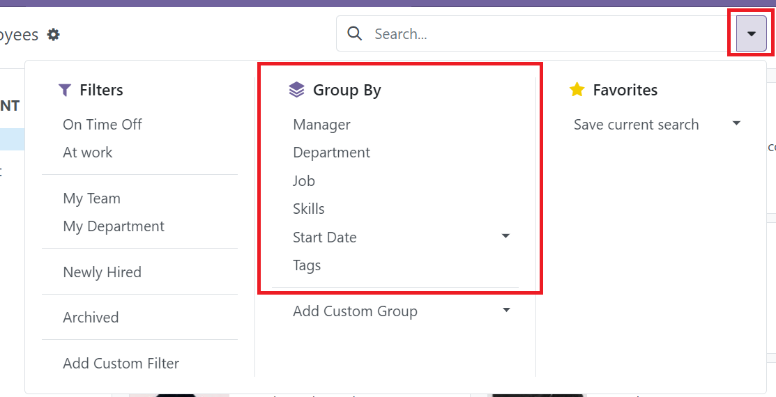 In Kanban view, some of them will have default grouping to enable organize records easier. To apply grouping, click the expand bar in the search bar. Then, select the preset group-by term for grouping.