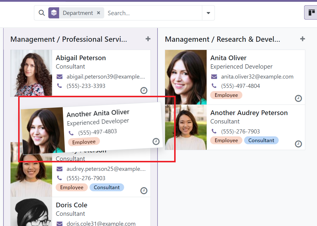 When Kanban view is grouped, the records can perform drag & drop feature to change the group. After dragging, the records will be updated together also.